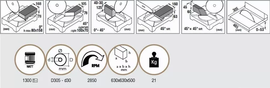 - Angle de coupe réglable de 0° à 50° à gauche et à 0°- 47° à droite, avec dispositif de verrouillage rapide à 0°-15°-22,5°-30°-45°.